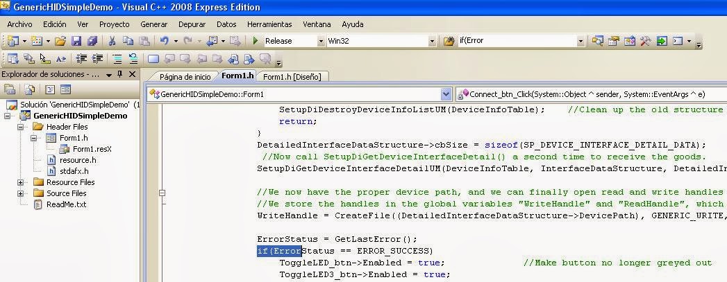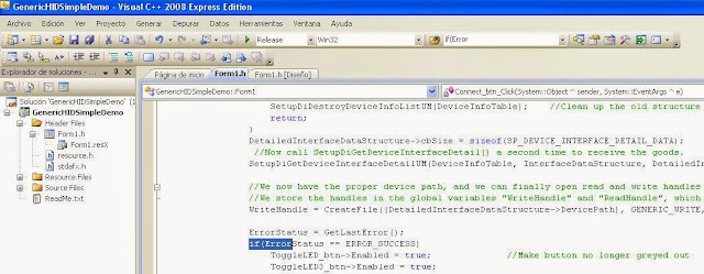 - Luego de cambiar el código de la línea 61 por: "# define MY_DEVICE_ID "Vid_04d8&Pid_003E" se le dice a Visual Studio que aquel dispositivo que habrá de reconocer lleva por identificador el número 003E. Sólo así volvió a haber comunicación entre las dos partes.