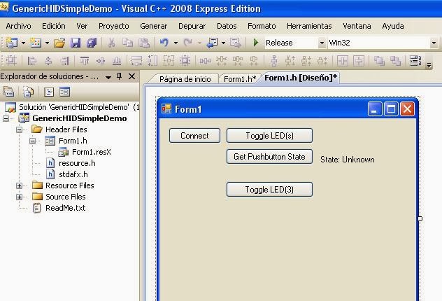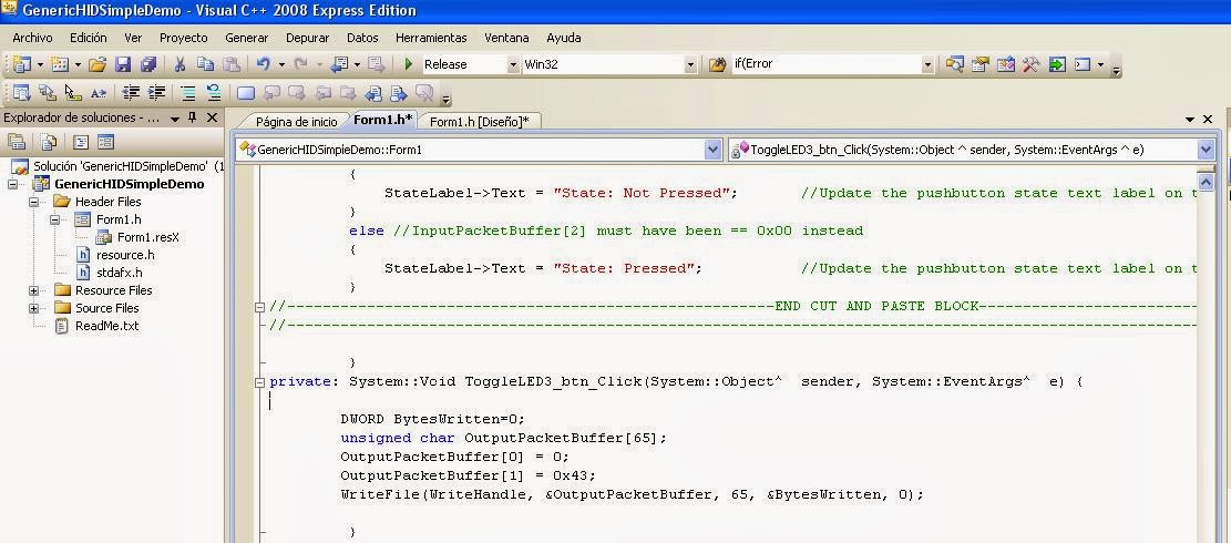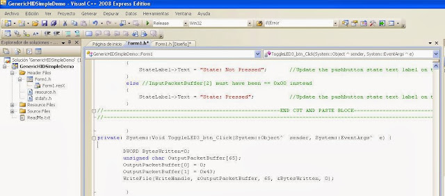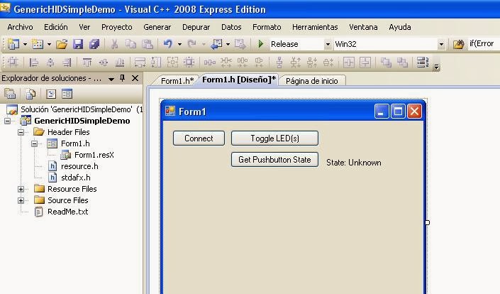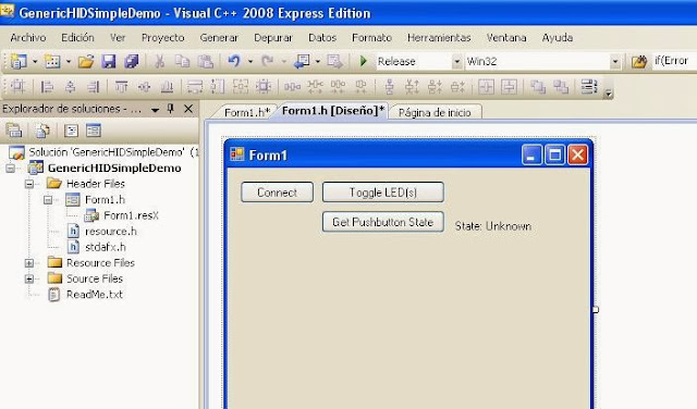 Localizar y abrir el proyecto de Visual Studio C++ GenericHIDSimpleDemo.sln y dar doble click en el archivo Form1.h ubicado en el explorador de soluciones. Entonces aparecerá en ventana la siguiente: