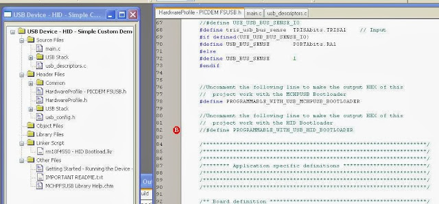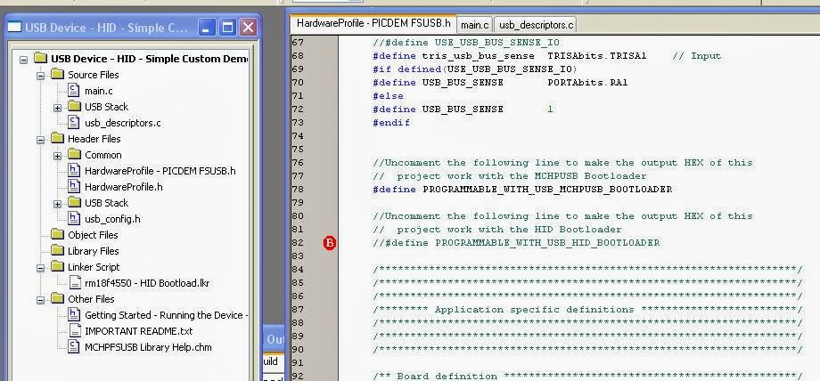 Localizar y abrir el proyecto USB Device-HID-Simple Custom Demo-C18-PICDEM FUSB.mcp en MPLAB y editar la línea 78 del archivo HardwareProfile-PICDEM FSUSB.h de modo que quede la línea 82 como en la figura: